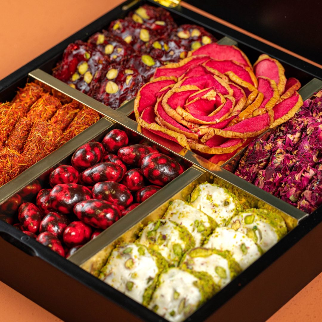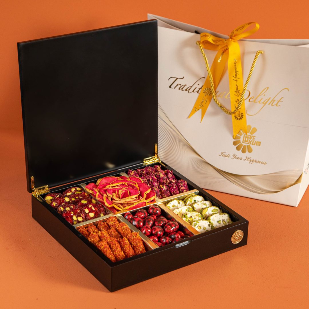 Daxilində təqdim olunan ləzzətlər müxtəlif zövqlərə xitab edir – faydalı quru meyvələr, seçmə drajelər, incə hazırlanmış şokolad assortisi və ənənəvi lokum çeşidləri hər açılışda zəngin dad təcrübəsi yaşadır.